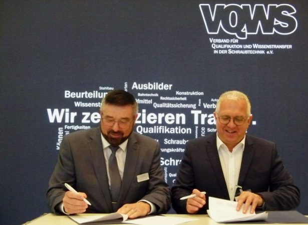 Foto: Vertragsunterzeichnung mit freudigem Schmunzeln: Hans-Martin Hanke 1. Vorstandsvorsitzender des VQWS (li.) und SchraubTec-Chef Bernd Weinig, Director Trade Fair Solutions & Partnerships der Vogel Communications Group