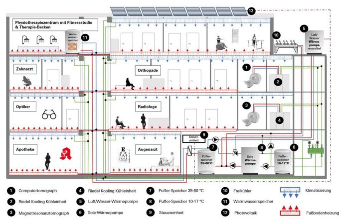 Lars Hofius führt weiter aus: „So schaffen wir echten Mehrwert mit einer Systemlösung. Auch mehrstöckige Ärztehäuser, in denen mehrere Praxen unter einem Dach zusammenarbeiten, lassen sich so, unter Einsatz von wenig elektrischer Leistung, hoch effizient mit Energie versorgen, also beheizen, klimatisieren und mit Warmwasser versorgen.