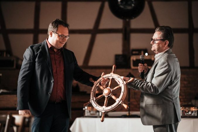 Im Anschluss an den Empfang begab sich die Gesellschaft in den Festsaal, der mit seinem hölzernen Dachstuhl und den groben Steinwänden ein Ambiente lieferte, das sowohl rustikal als auch edel war. An mehreren großen Tischen verteilten sich Gäste und Mitarbeiter der Andreas Laubner GmbH, dann begann das Abendprogramm mit einer Rede der beiden Geschäftsführer Andreas Laubner und Michael Hillenbrand. Themen waren ein Rückblick auf die Firmengeschichte, Meilensteine sowie ein Ausblick auf die Zukunft des Unternehmens. Auch der langsam voranschreitende Wechsel in der Geschäftsführung wurde mit einer symbolischen Geste thematisiert: Andreas Laubner übergab Michael Hillenbrand ein hölzernes Steuerrad. Der tatsächliche Austritt Laubners aus dem Unternehmen hinein in den wohlverdienten Ruhestand liegt jedoch noch in der Zukunft.