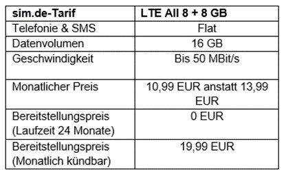 Der Aktionstarif LTE All 8 + 8 GB von sim.de enthält neben 16 GB Datenvolumen eine Flatrate zum Telefonieren und SMS-Schreiben. EU-Roaming ist ebenfalls inklusive. Die Aktion ist nur für kurze Zeit verfügbar.