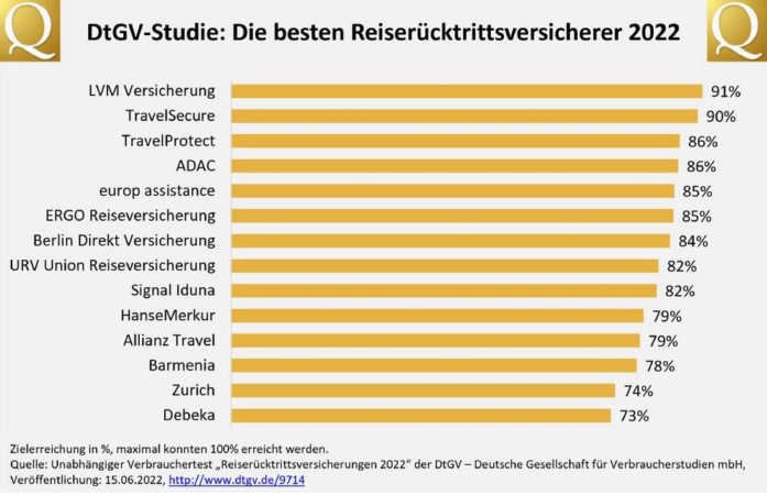 Über die Studie: Im Mittelpunkt der Studie standen die Versicherungsprodukte der folgenden 14 Anbieter: ADAC, Allianz Travel, Barmenia, Berlin Direkt Versicherung, Debeka, ERGO Reiseversicherung, Europ Assistance, HanseMerkur, LVM Versicherung, SIGNAL IDUNA, TravelProtect, TravelSecure, URV, Zurich.