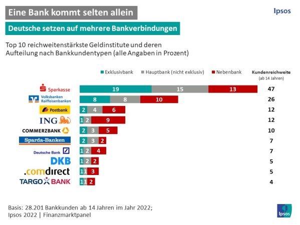 Insbesondere Direktbanken ohne Filialstruktur weisen einen auffällig niedrigen Anteil an Exklusivkunden auf. Die Mehrheit der Kunden von Direktbanken, wie der ING oder DKB, sind Nebenbankkunden. Viele Deutsche scheinen also die Vorzüge von Direktbanken zu schätzen, verlassen sich allerdings nur selten ausschließlich auf solche. Die Verankerung von Filialbanken ist weiterhin wichtig, trotz dem deutschlandweit anhaltenden Trend der Filialschließungen.