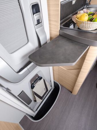 Beide Grundrisse des X-Cursion VAN verfügen über eine geräumige Küche mit Spüle, Zweiflamm-Kocher und 90-Liter-Thetford-Kompressorkühlschrank. Boiler und Heizung sind dieselbetrieben, sodass Gas nur für den Kocher benötigt wird und somit eine 5 kg-Gasflasche ausreicht. Mit einer Innenbreite von 200 cm, einer Fahrzeuggesamthöhe von 285 cm und -länge von 588 cm ist der neue Teilintegrierte geräumig und gleichzeitig kompakt.