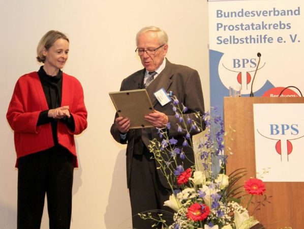 Prof. Dr. Peter Albers, Direktor der Klinik für Urologie am Universitätsklinikum Düsseldorf und Leiter der Abteilung für personalisierte Früherkennung des Prostatakarzinoms am Deutschen Krebsforschungszentrum (DKFZ) in Heidelberg, ehemaliger Präsident der Deutschen Krebsgesellschaft und Leiter der Zertifizierungskommission „Prostatakrebs“ unterstützt den BPS seit vielen Jahren in den Bemühungen zur bestmöglichen Früherkennung von Prostatakrebs und der Anerkennung der „Aktiven Überwachung“ als gleichwertige Therapieoption. Aktuell beschäftigt sich das Team von Prof. Albers mit dem Aufbau einer Risikosprechstunde für Männer mit familiärer Belastung. Dieses Projekt, das von der Deutschen Krebshilfe gefördert wird, verspricht neue fundierte Kenntnisse in der urologischen Behandlungs- und Beratungspraxis für Männer mit einem erblich bedingten Risiko an Prostatakrebs zu erkranken. Prof. Albers bedankte sich mit den Worten: „Ich bin ein bisschen gerührt, so oft passiert einem das nicht im Leben. Ich bin fast 35 Jahre in der Urologie tätig und weiß nun, wo die wirklichen Probleme des Prostatakrebses liegen. Daher versuche ich, die Krankheit durch eine intelligente, zielgenaue Früherkennung zu attackieren und ich denke, dass kommende Generationen von den gravierenden Verbesserungen profitieren werden.“