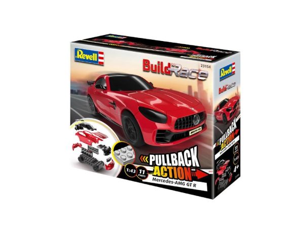 Bei den Build n’ Race Modellen können sich auch die Kleinsten große Autoträume erfüllen. Der Mercedes-AMG GT R, erhältlich in stylischem Grau, coolem Metallic-Grün oder rasantem Rot, ist mit nur 10 Teilen schnell gebaut und eignet sich damit besonders für junge Rennfans und den Modellbaunachwuchs ab vier Jahren. Die einzelnen Teile werden von Noppen verbunden und sind somit einfach zusammenzustecken. Außerdem sind die rasanten Flitzer dadurch mit den Bausteinen anderer Hersteller kompatibel, die die meisten schon im Kinderzimmer haben. Dadurch können die jungen Autodesigner ihre Kreativität komplett ausleben: Sie gestalten ihr Traumauto ganz nach ihren Wünschen und rasen dann mit ihrem individuellen Wagen durch das Kinderzimmer. Die Basis der Revell-Modelle ist ein Chassis mit Rückziehmotor; mit den eigens gestalteten Modellen können die kleinen Autobauer damit direkt in rasante Rennen gegen ihre Freunde starten.