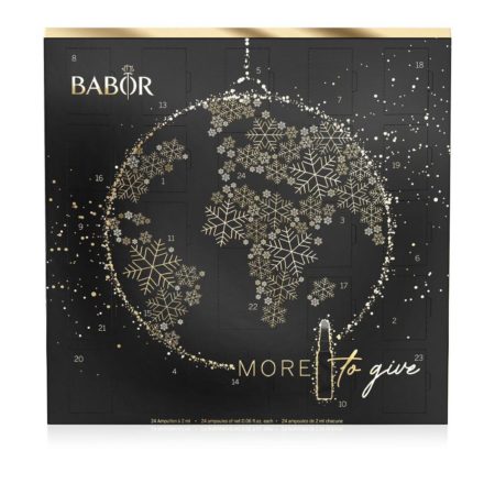 Das elegante Design des Kalenders zelebriert in klassischem Schwarz und Gold unseren Planeten: Die Silhouette, umrahmt durch gold-glänzenden Sterne, filigrane Schneeflocken stellen Kontinente dar. Damit auch die Weihnachtsfeste der Zukunft sicher sind, sehen wir bei BABOR Achtsamkeit gegenüber der Umwelt als Teil unserer DNA – „more to give“ – sowohl für die Haut als auch für die Umwelt. Das Innere des Kalenders verzichtet erneut komplett auf Plastik!