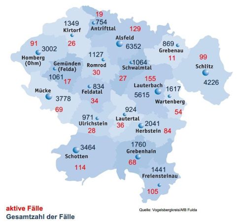 40 neue Corona-Fälle meldet das Gesundheitsamt des Vogelsbergkreises am Freitag. 56 Menschen haben sich als genesen gemeldet, sodass die Behörde aktuell 1.196 aktive Fälle betreut.