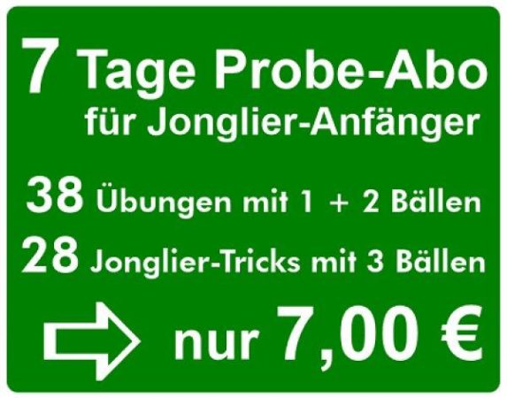 Die Online-Akademie Jonglieren ist Deutschlands größtes Jonglier-Lernportal für Anfänger und Fortgeschrittene und bietet ab sofort ein 7-Euro-Ticket an, das für 1 Woche (7 Tage) vollen Zugriff sowohl auf ein Jonglier-Lernprogramm mit 34 Video-Tutorials ermöglicht als auch auf 37 weitere Wurf- und Fangübungen mit 1 und 2 Bällen anbietet.