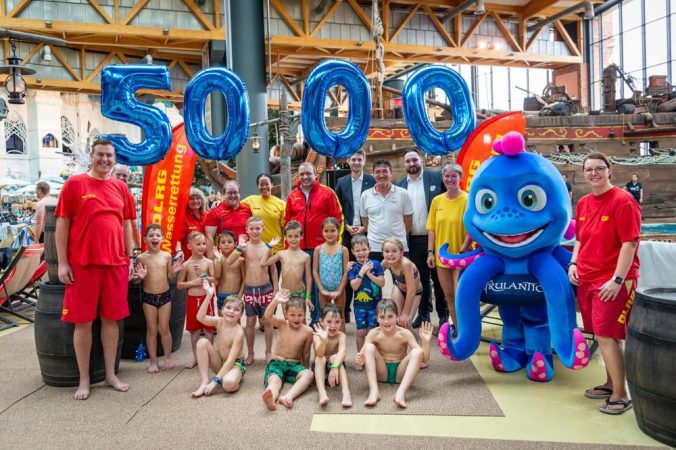 Seit Anfang 2020 bietet die Wasserwelt in Zusammenarbeit mit den ehrenamtlichen Prüfern der Deutschen Lebens-Rettungs-Gesellschaft e.V. (DLRG) allen Kindern immer samstags von 12 bis 15 Uhr sowie von 17 bis 18 Uhr die Möglichkeit, die Prüfung zum Seepferdchen abzulegen. Dieses kostenlose Angebot erfreut sich großer Beliebtheit, sodass jetzt am 12. November bereits das 5.000ste Seepferdchen in Rulantica verliehen wurde. Mit einem Sprung vom Beckenrand geht es dafür ins kühle Nass der Wasserwelt. Anschließend folgen 25 Meter Schwimmen, das Heraufholen eines Ringes mit den Händen aus schultertiefem Wasser und eine kleine theoretische Prüfung, bei der die Baderegeln abgefragt werden. Wer diese Aufgaben unter den wachsamen Augen der Schwimmprofis der DLRG besteht, wird mit dem Seepferdchen ausgezeichnet. Der Frühschwimmer ist das erste Abzeichen, dass Kinder erlangen können und ein wichtiger Meilenstein der Schwimmausbildung.