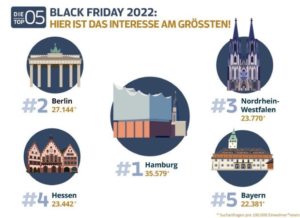 Mit 35.579 Online-Suchanfragen pro 100.000 Einwohner*innen (EW) landet die Hansestadt auf dem ersten Platz, was das Interesse am Black Friday angeht. Somit lässt sich erahnen, dass es auch dieses Jahr am Black Friday in den Einkaufsstraßen an der Mönckebergstraße, Spitalerstraße und co. voll werden wird. Kein Wunder – hier ist auch das Monatseinkommen mit durchschnittlich 5209€ Brutto am höchsten!