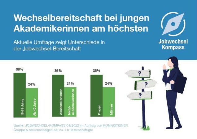 „Inflation, Krieg in der Ukraine und die hoffentlich auslaufende, aber immer noch nicht ganz überwundene Pandemie sind schwierige Rahmenbedingungen. Trotzdem bewegt sich die Wechselbereitschaft in Deutschland nach wie vor auf hohem Niveau. Die Deutschen bleiben rund um ihre Arbeitssituation optimistisch. Das ist eine Trendwende – denn bisher war die Stimmung auf dem Arbeitsmarkt ein Konjunkturbarometer. Das ist nun anders. Derzeit ist sie losgelöst von der wirtschaftlichen Entwicklung“, interpretiert Nils Wagener, Geschäftsführer der KÖNIGSTEINER Gruppe die Ergebnisse des regelmäßigen Arbeitsmarktbarometers. Zum Ende des Jahres 2022 schätzen Beschäftigte ihre Chancen auf dem Arbeitsmarkt als noch besser ein als noch vor drei Monaten. Aktuell glauben 68 % hier gute Möglichkeiten zu besitzen – 7 % mehr als im letzten Quartal. Auch was die Zukunft betrifft, sind die Deutschen hinsichtlich ihrer Position auf dem Jobmarkt durchaus optimistisch. So sind 24 % überzeugt, dass sich ihre Situation in 12 Monaten noch einmal verbessert hat, während weitere 55 % von einer Verfestigung ihrer ohnehin schon guten Situation in diesem Zeitraum ausgehen. „Wir sehen an unseren Zahlen nach wie vor eine hohe Neigung, den Job zu wechseln. Vor allem weibliche Beschäftigte und junge Menschen schauen sich verstärkt nach neuen Chancen bei anderen Arbeitgebern um. Der Arbeitsmarkt bleibt also vital und vom Arbeitskräftemangel geprägt.“, so Peter Langbauer, Geschäftsführer der Online-Jobbörse stellenanzeigen.de, zu den Ergebnissen.