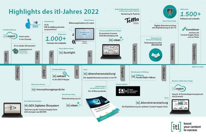 Eine neue Dienstleistung tritt ins Rampenlicht von itl. Mit „TeMa. Marketing für Technik“ schließt itl eine Lücke in der Dienstleistungskette entlang des Information Lifecycles. Mehr Informationen zum Technischen Marketing gab es im September und Oktober 2022 bei der kostenlosen Abendveranstaltungsreihe „Smarte Features – cooles Budget. Marketing für Technik“. Die Referent:innen stellten Praxisbeispiele aus dem Technischen Marketing vor und zeigten, wie auf Basis der Technischen Dokumentation und ihrer Übersetzungen smarte Ergebnisse fürs Marketing erreicht werden können. Mehr dazu