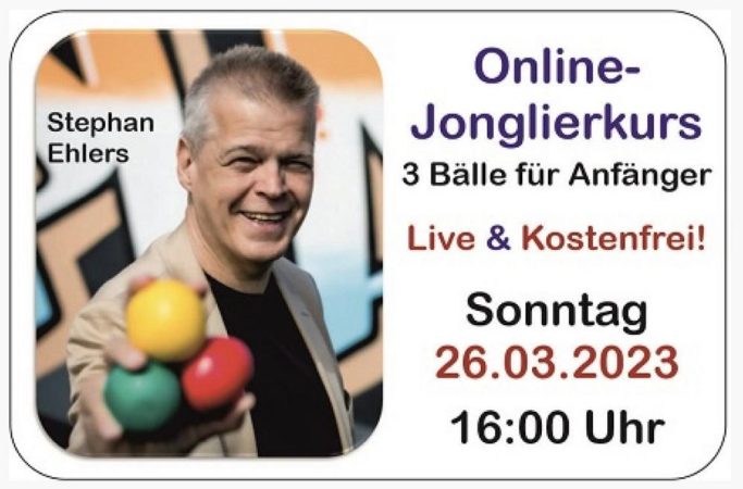 In diesem Workshop lernt man in verblüffend kurzer Zeit das Jonglieren mit 3 Bällen bei Deutschlands erfolgreichstem Jongliertrainer. Nach dem Kurs kann man allein weiterüben… dazu gibt es hinterher für alle Teilnehmer Hinweise und Links zu kostenfreien Video-Tools und Lern-Apps. Die Teilnahme an diesem Online-Workshop ist KOSTENFREI!
