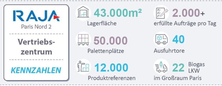 Die RAJA-Gruppe betreibt 15 Vertriebszentren in Europa, davon fünf in Frankreich, mit einer Gesamtfläche von 400.000 m2. Das Unternehmen gewährleistet europaweit Lieferungen innerhalb von 24 bis 48 Stunden, abhängig vom Zeitpunkt der Bestellung und dem Lieferort.