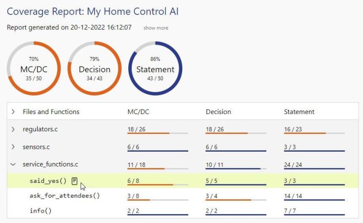 Weiter optimiert wurde in Testwell CTC++ 10 auch die Erzeugung der Berichte, die jetzt noch einfacher und performanter erfolgt. So entfällt beispielsweise der bisherige Zwischenschritt über einen reinen Text-Report. Mit der Version 10 vereinfacht sich außerdem die Coverage-Messung für unterschiedlich präprozessierte Header-Varianten und für bedingt kompilierten Code drastisch. Für alle Code-Varianten werden vollständige, gleichartige Berichte generiert.