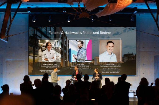 Nach der offiziellen Begrüßung durch Tobias Oppenheim von der DZ BANK und einigen persönlichen Worten der AXICA-Prokuristin Nathalie Dahmann-Harbecke, hatte der AXICA-Nachhaltigkeitsbeauftragte André Steuer das Wort. Thema seines kurzen Impulses: „Talente & Nachwuchs finden und fördern“. Als Prüfer der IHK für die Auszubildenden im Bereich Küche und als Vorsitzender des Vereins der Hauptstadtköche ist dieses Thema für André Steuer eine Herzensangelegenheit. Kompetente Unterstützung hatte er sich mit Annette-Suzanne Voigt, Berufsschullehrerin, Köchin & IHK-Prüferin und Stefan Marx, CEO und Co-Founder ZAUBAR, auf die Bühne geholt.
