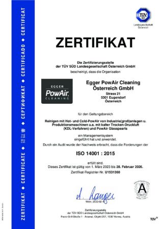 Industriemaschinenreiniger Egger PowAir Cleaning GmbH von TÜV – SÜD bis 2026 ISO 14001 : 2015 zertifiziert.