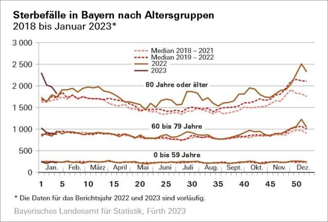 Wie das Expertenteam des Bayerischen Landesamts für Statistik nach Auswertung vorläufiger Daten weiter mitteilt, liegt die Zahl an Verstorbenen im Freistaat im Januar 2023 mit 14 086 Personen insgesamt mehr als zwölf Prozent über dem Niveau des Medians der Jahre 2019 bis 2022 (12 550 Verstorbene). Dabei verzeichnet das Bayerische Landesamt für Statistik bei Personen unter 60 Jahren einen Rückgang der Sterbefälle um etwa sieben Prozent. Bei den 80-Jährigen und Älteren liegen die Sterbefallzahlen ca. 19 Prozent über dem Median der Jahre 2019 bis 2022.