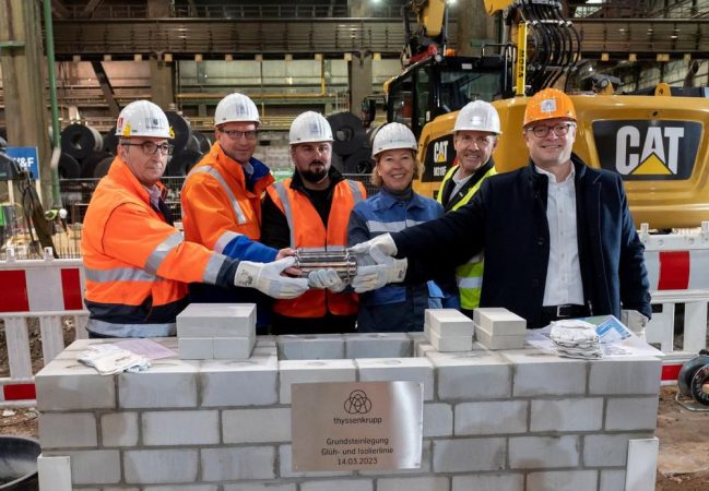 thyssenkrupp Steel setzt die Zukunftsstrategie 20-30 weiter konsequent um: Am Standort Bochum fand heute die Feier zur Grundsteinlegung der neuen Glüh- und Isolierlinie statt. Mit dem modernen und energieeffizienten Aggregat können noch dünnere Elektrobänder mit besonders homogenen mechanischen und magnetischen Eigenschaften hergestellt werden. Sie sind auf die Anforderungen hocheffizienter Motoren ausgelegt, die vor allem in Elektrofahrzeugen zum Einsatz kommen. Dafür wird die Anlage zukünftig bis zu maximal 218.000 Tonnen pro Jahr nicht kornorientiertes Elektroband herstellen. Die Investitionssumme beträgt rund 150 Millionen Euro. Projektpartner ist der Anlagenbauer SMS group aus Düsseldorf. Die Fertigstellung des Aggregats ist für 2024 geplant.
