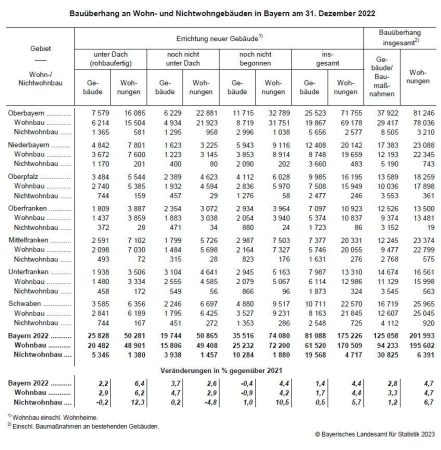 Den Bauüberhang in Bayern am 31. Dezember 2022 beim Wohnneubau nach Regierungsbezirken betrachtet, weist Niederbayern mit 38,7 Prozent den höchsten Anteil an rohbaufertigen Wohnungen auf. Ebenso über dem bayernweiten Durchschnitt von 28,7 Prozent liegen Oberfranken, Mittelfranken und die Oberpfalz. Nach Bauzuständen differenziert, steigt die Anzahl der rohbaufertigen Wohnungen gegenüber Ende 2021 um 6,2 Prozent beziehungsweise 2 856 auf aktuell 48 901 Wohnungen. Das vergleichbare Plus beim Bauzustand „noch nicht unter Dach“ beträgt 2,9 Prozent und der Zuwachs beim Bauzustand „noch nicht begonnen“ 4,2 Prozent.
