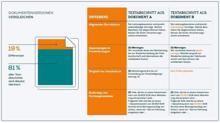 Sollen zwei Dokumente eines Versicherers verglichen werden, sind die Formate und Formulierungen in der Regel sehr nah beieinander. Je ähnlicher die Dokumente sind – oder je besser ich die Inhalte kenne – desto eher werden beim manuellen Vergleich Unterschiede übersehen.