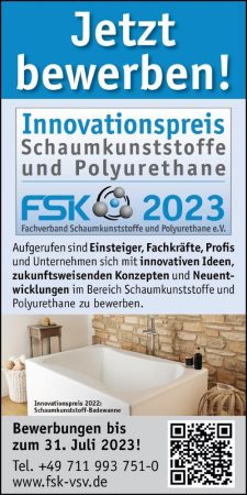 „Wir spüren deutlich, was in der Industrie los ist. In der Branche der Polyurethane und Schaumkunststoffe fehlt es nicht an Innovationen. Kaum eine andere ist so zukunftsträchtig und entwicklungsfreudig. Es fehlt an der Zeit! Aus den Reihen der Mitglieder hören wir klar, dass es ein turbulentes Jahr ist und vieles hintenanstehen muss, was über das Kerngeschäft hinausgeht. Deshalb haben wir beschlossen allen etwas mehr Zeit zu geben und verlängern daher kurzfristig die Bewerbungsfrist für unseren Innovationspreis bis zum 31.07.2023“, so FSK-Geschäftsführer Klaus Junginger. „Die Bewerbungskriterien und das Verfahren sind unverändert. Wir haben auch schon einige starke Bewerbungen, möchten aber weiteren Kandidaten die Chance eröffnen Ihr Projekt einzureichen.“