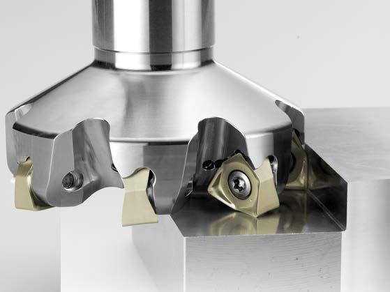 Die einzigartigen Hartmetall-WSP verfügen über sechs nutzbare Schneidkanten, die dank einer negativen Geometrie für Kosteneinsparungen und eine ausgezeichnete Bearbeitungszuverlässigkeit sorgen und dennoch ein scharfes positives Zerspanen ermöglichen.Dies sorgt für geringe Schnittkräfte. Eine höhere WSP-Dicke gegenüber herkömmlichen Typen ermöglicht eine ausgezeichnete Bruchfestigkeit und garantiert jederzeit ein verlässliches Bearbeitungsergebnis. Darüber hinaus ermöglicht eine große maximale Schnitttiefe von bis zu 8 mm ein effizientes Schulterfräsen. Um die Erwartungen an die Oberflächengüte der Werkstücke zu erfüllen, weist die Stirn aller WSP eine Geometrie mit großem Radius auf, die wie ein traditioneller Wiper arbeitet.