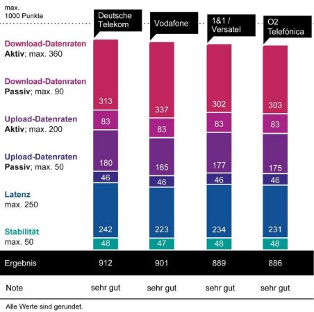 Mit 889 Punkten liegt 1&1/Versatel auf Platz drei, ebenfalls mit dem Testurteil „sehr gut“. Bei den aktiven Upload-Messungen erreicht der Netzbetreiber bundesweit Platz zwei, ebenso bei den gemessenen Latenzen.