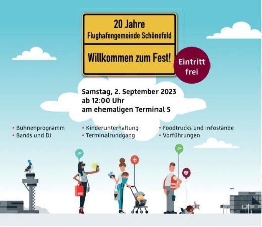 Die Großgemeinde Schönefeld wird dieses Jahr 20 – und das soll gefeiert werden. Anlässlich des Jubiläums des Zusammenschlusses der ehemals selbständigen Gemeinden lädt die Gemeinde Schönefeld mit ihren heutigen sechs Ortsteilen zu einem bunten Familienfest ein. Veranstaltet wird das Fest am 02.09.2023 ab 12 Uhr gemeinsam mit der Flughafen Berlin Brandenburg GmbH am ehemaligen Terminal 5. Neben einem bunten Bühnenund Kinderprogramm, LiveMusik, Foodtrucks und Infoständen wird es die Möglichkeit geben, das Terminalgebäude des ehemaligen Flughafens BerlinSchönefeld noch einmal bei einem Rundgang zu besichtigen.