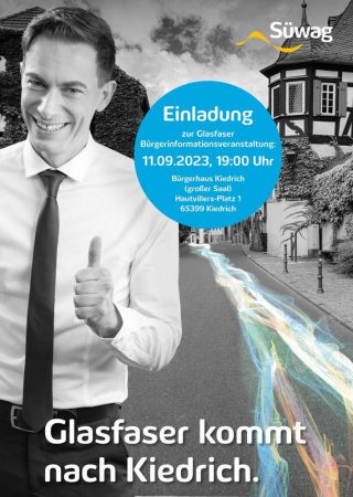 Mehr Informationen zum Glasfaserausbau erfahren Bürger auf der Informationsveranstaltung, die am 11.09.2023, 19:00 Uhr, im großen Saal des Kiedricher Bürgerhauses, Hautvillers-Platz 1, 65399 Kiedrich stattfindet.