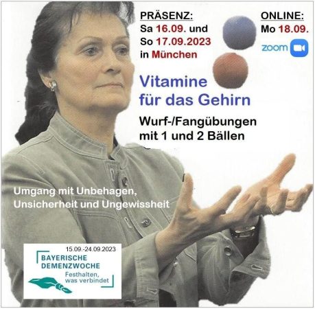 Das Bayerische Staatsministerium veranstaltet vom 15. bis 24. September die Bayerische Demenzwoche 2023. Die Jonglierschule München ist einer der vielen Partner und Akteure, die bayernweit über 900 vielfältige Veranstaltungen rund um das Thema Demenz anbieten. Der Workshop "Jonglieren – Vitamine für das Gehirn" findet sowohl LIVE in PRÄSENZ am Sonntag, 17.9. um 11:00 Uhr als auch ONLINE via ZOOM am 18.9. um 18:00 Uhr statt. Er richtet sich an Menschen, die selbst von Demenz betroffen sind sowie an Menschen, die Demenzerkrankte betreuen oder pflegen. Sie bekommen Antworten auf Fragen rund um körperliche Aktivität und Bewegung bei Demenz: