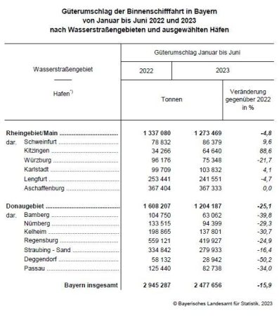 Der Güterumschlag an der Donau liegt mit einer Abnahme um 25,1 Prozent bei 1,20 Millionen Tonnen. Das entspricht einem Anteil von 48,6 Prozent am Gesamtumschlag Bayerns. Im Maingebiet, das einen Anteil von 51,4 Prozent am Gesamtumschlag hat, sinkt der Güterumschlag von Januar bis Juni 2023 um 4,8 Prozent auf 1,27 Millionen Tonnen. Die umschlagstärksten Häfen sind Regensburg mit knapp 420 000 Tonnen und Aschaffenburg mit gut 367 000 Tonnen.
