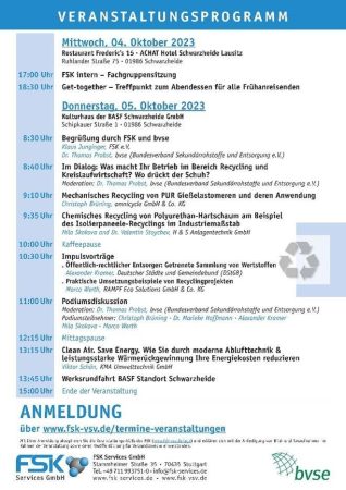 Kurzentschlossene können sich noch bis zum 29. September 2023 für den gemeinsamen Fachtag Recycling und Verwertung des Fachverband Schaumkunststoffe und Polyurethane (FSK e.V.) und des bvse (Bundesverband Sekundärrohstoffe und Entsorgung e.V.) anmelden. Am 5. Oktober beleuchten und diskutieren Experten Herausforderungen und Lösungen des mechanischen und chemischen Recyclings im Kulturhaus der BASF Schwarzheide GmbH.