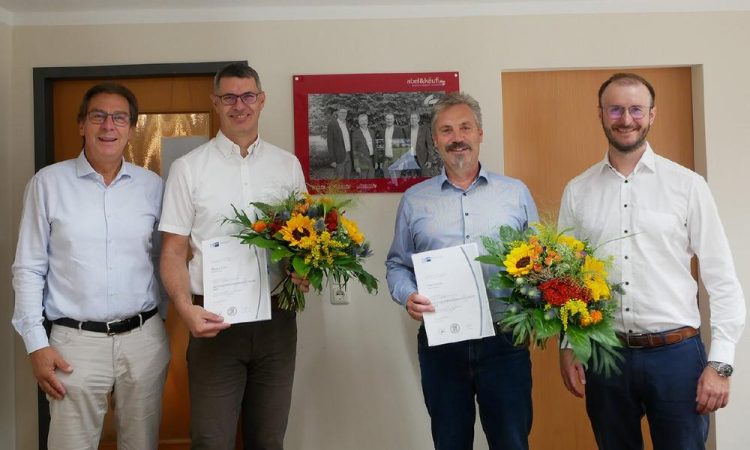 Im Rahmen einer Arbeitssitzung überraschte Hans Graf, Vorsitzender des IHK Gremiums Landshut, seine Geschäftsführerkollegen und ehrte sie für ihre langjährigen Betriebszugehörigkeiten: Markus Ernle blickt auf 35 Jahre, Franz Ketzer bereits auf 40 Jahre zurück. Seit 1998 führen beide als Geschäftsführer und Gesellschafter das Unternehmen und haben maßgeblich zum Wachstum und Erfolg beigetragen. Hans Graf und Michael Schirrmacher gratulierten zu den runden Jubiläen und bedankten sich bei beiden für ihren langjährigen Einsatz für das Unternehmen mit Ehrenurkunden der IHK und einem Präsent.