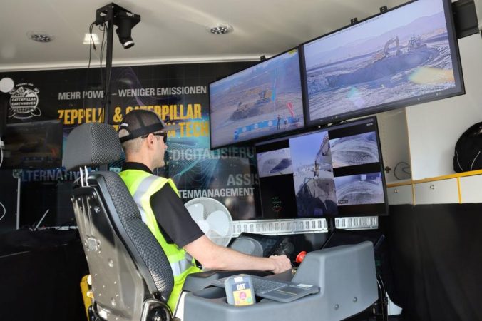 „Unsere Station ist eine vielseitig nutzbare Universalstation, mit der eine Person bis zu vier verschiedene Baumaschinen bedienen kann. Daher bewegt der Fahrer auch nicht die typischen Bagger-Joysticks, sondern Universal-Joysticks, die etwa auf einem Bagger, aber auch auf einer Raupe funktionieren müssen“, machte Christian Berling, Caterpillar Vertriebsbeauftragter für CatCommand, deutlich. Und das wurde dem Messepublikum ebenfalls gezeigt. Denn die Station auf der steinexpo baute nicht nur eine Verbindung für den kontinuierlichen Datenaustausch über ein lokales Wifi zu dem rund 30 Meter entfernten Cat Kettenbagger 323, sondern auch über das öffentliche 5G-Netz bis ins 1 900 Kilometer entfernte Málaga auf. Aus dem Anhänger mit der Bedienstation funkte eine Wifi-Antenne mit einer Frequenz von 2,4 Gigahertz, die dann von dem Cat 323 empfangen wurde. Selbst eine Verbindung bis nach Spanien war möglich, wo Caterpillar eine große Demofläche unterhält. Dort befand sich ein Cat Kettenbagger 340 und eine Cat Raupe D7, die von Nieder-Ofleiden aus ebenfalls per Cat Command ferngesteuert wurden. „Wir wollen demonstrieren, wie sich präzise damit arbeiten lässt, selbst wenn man nicht mehr direkt in der Fahrerkabine sitzt. Bereits heute sind Cat Bagger der Baureihe 320 bis 395 und Cat Raupen D6 XE und D7 damit verfügbar. Die Fernsteuerung von Baumaschinen ist daher keine Vision mehr, sondern Zeppelin kann das heute schon Kunden anbieten und sie dabei unterstützen, Cat Command zeitnah auch ins Feld zu bringen. Die Systeme laufen erfolgreich in den USA und seit April gibt es sie auch in Europa“, so Christian Berling.