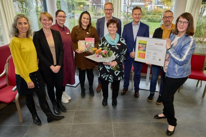 Das Projekt „Unsere kleine Farm“ unterstützt als erstes Leuchtturmprojekt die Gesundheitsförderung und Prävention in der stationären Pflege und konnte auch mit dem besonderen Fokus auf die Angehörigen-Arbeit überzeugen. Eigentliches Ziel des Projekts ist es, die Bewohnerinnen und Bewohner in den Bereichen Mobilität, gesunde Ernährung und psychosoziales Wohlbefinden durch gesundheitsfördernde Angebote in der Natur und mit Tieren zu unterstützen. Damit sollen die Projektteilnehmenden in ihrem Gesundheitsverhalten gestärkt und präventiv Erkrankungen entgegengewirkt werden.