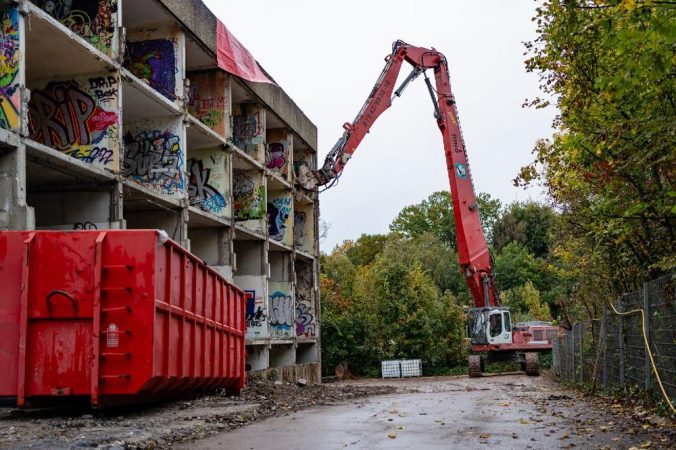 Mit den Abbrucharbeiten wurde das Unternehmen Rino Bau und Transport aus Renchen beauftragt. Das Baumaterial wird vor Ort mit dem Brecher aufgearbeitet und soll dem Kreislauf-Gedanken folgend, so weit wie möglich für einen späteren Neubau wiederverwendet werden.
