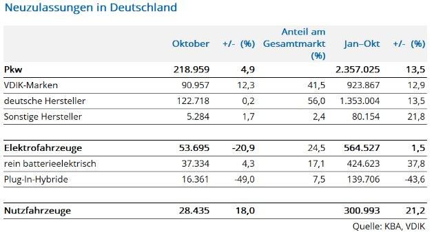 Mit 218.959 Neuzulassungen wuchs der Pkw-Markt im Oktober im Vergleich zum Vorjahresmonat nur moderat. Laut Kraftfahrt-Bundesamt wurden 4,9 Prozent mehr Pkw zugelassen. Allerdings hatte der Oktober dieses Jahr einen Arbeitstag mehr als 2022. Bereinigt um die Anzahl der Arbeitstage ergäbe sich nahezu keine Veränderung zum Vorjahrsmonat (-0,1 Prozent). Die Zulassungen der VDIK-Marken legten mit plus 12,3 Prozent etwas stärker zu. Der VDIK-Marktanteil lag im Oktober bei 41,5 Prozent. Insgesamt wurden zwischen Januar und Oktober dieses Jahres 2.357.025 Pkw neu zugelassen, was einem Plus von 13,5 Prozent zum Vorjahreszeitraum entspricht.