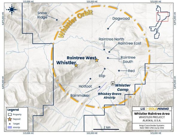 U.S. GoldMining Inc. ist ein Explorations- und Erschließungsunternehmen, das sich auf die Weiterentwicklung des zu 100 % unternehmenseigenen Gold-Kupfer-Projekts Whistler konzentriert, das sich 105 Meilen (170 Kilometer) nordwestlich von Anchorage, Alaska, USA, befindet. Das Projekt Whistler besteht aus mehreren Gold-Kupfer-Porphyr-Lagerstätten und Explorationszielen innerhalb eines großen regionalen Landpakets von insgesamt etwa 53.700 Acres (217,5 Quadratkilometer). GoldMining Inc. (GOLD:TSX) besitzt 9,88 Millionen Aktien von U.S. GoldMining Inc. bzw. etwa 80 % der ausstehenden Basisaktien.