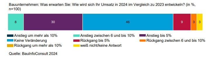 Im Verlauf des zweiten Quartals 2024 hat das Düsseldorfer Marktforschungsinstitut BauInfoConsult deutschlandweit unter anderem 100 Bauunternehmen in telefonischen Interviews zu ihren Erwartungen an die Umsatzentwicklung ihres Unternehmens für das Gesamtjahr befragt. Das Ergebnis zeigt: Fast jede zweite Baufirma geht von einem Ergebnis aus, das dem des Vorjahrs in etwa entspricht. Ein starkes Drittel (38 Prozent) geht von einer Umsatzsteigerung aus (überwiegend im moderaten Bereich von bis zu 5 Prozent).
