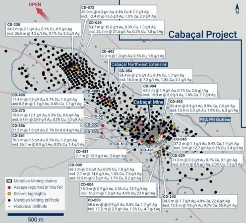 • Meridian findet eine starke Au-Cu-Ag-Mineralisierung bei Cabaçal mit einem Gehalt von 13,4 m @ 4,6 g/t AuEq*;