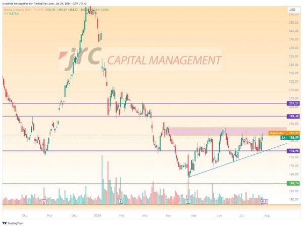 Insgesamt lässt sich sagen, das sich Boeing auf einem guten Weg befindet, die aufgrund der rechtlichen und technischen Schwierigkeiten entstandene Situation in den Griff zu bekommen. Das zeigt sich auch im Aktienkurs, welcher sich nach einer 40%igen Abwärtsbewegung seit dem Hoch im Dezember 2023 wieder um 18% erholen konnte. Anleger sollten hier die weiteren Entwicklungen der Situation im Auge behalten. Interessant wird zudem auch die bevorstehende Veröffentlichung der Quartalsergebnisse am kommenden Mittwoch (vorbörslich).