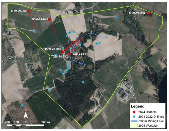 Die Bohrlöcher TOM24-041 bis -043 zielten auf die Massivsulfidlinse der Steffenburgs-Zone neigungsabwärts unterhalb der Löcher TOM21-025, -028 und TOM22-038 ab, die durch Abschnitte von 14,3 m mit 14,2 % ZnÄq1 (210,0 bis 224,3 m), 30,05 m mit 10,9 % ZnÄq1 (148,35 bis 178,40 m) bzw. 25,5 m mit 8,2 % ZnÄq1 (249,0 bis 274,1 m) gekennzeichnet waren. TOM24-042 wurde 105 m unterhalb von TOM22-038 gebohrt, wo die Mineralisierung in der Tiefe weiterhin weit offen ist.