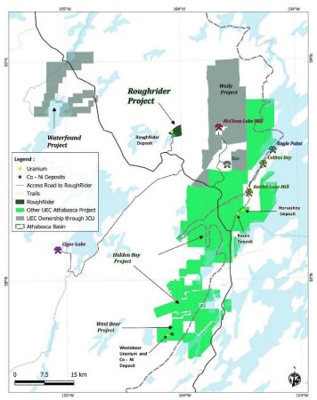 Das Projekt Roughrider ist ein Uranprojekt im östlichen Athabasca-Becken im Norden von Saskatchewan, Kanada, einem der wichtigsten Uranabbaugebiete der Welt. Das Projekt befindet sich etwa 13 Kilometer westlich der Mühle McClean Lake von Orano, in der Nähe der bestehenden Grundstücke von UEC im Athabasca-Becken. Die Tiefe der Mineralisierung auf dem Projekt beträgt etwa 200 m und befindet sich hauptsächlich im Grundgestein unterhalb der Diskordanz.