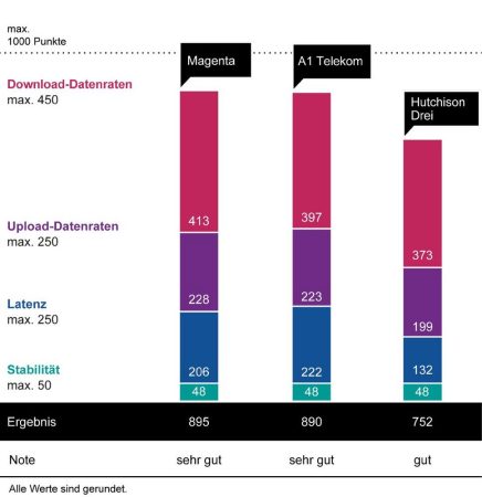Magenta Telekom ist Testsieger mit 895 von 1.000 möglichen Punkten und der Note „sehr gut“ – der Anbieter überzeugt besonders bei den durch aktive Messungen ermittelten Download- und Upload-Datenraten. In der Bewertung der Stabilität liegen alle drei bundesweit aktiven österreichischen Anbieter gleichauf. Im Vergleich zum Vorjahresergebnis erzielt Magenta Telekom auch im diesjährigen Test dieselbe Punktzahl.