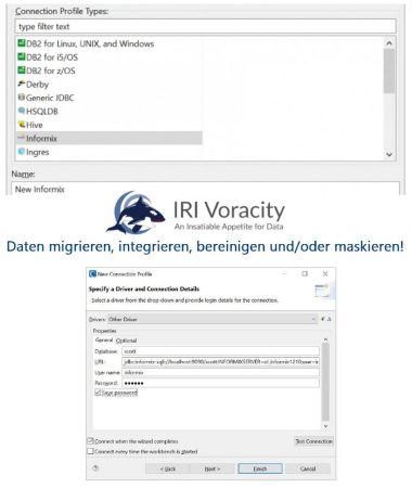 Der Artikel beschreibt die Konfigurationen, die erforderlich sind, um 64-bit Informix Dynamic Server (IDS) Tabellenquellen und -ziele in der IRI Workbench und kompatiblen CoSort-Umgebungen zu nutzen. Diese Schritte sind vergleichbar mit den Verbindungen zu anderen relationalen Datenbanksystemen wie MS SQL, Oracle, PostgreSQL, Salesforce, Snowflake und Teradata.