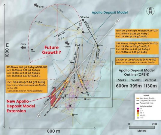 38,25 Meter @ 2,44 g/t Goldäquivalent aus 732,55 Metern in der SW-Erweiterungszone und das Bohrloch endete in der Mineralisierung– 258,30 Meter @ 1,56 g/t Goldäquivalent aus 253,40 Metern (APC99-D2) einschließlich: