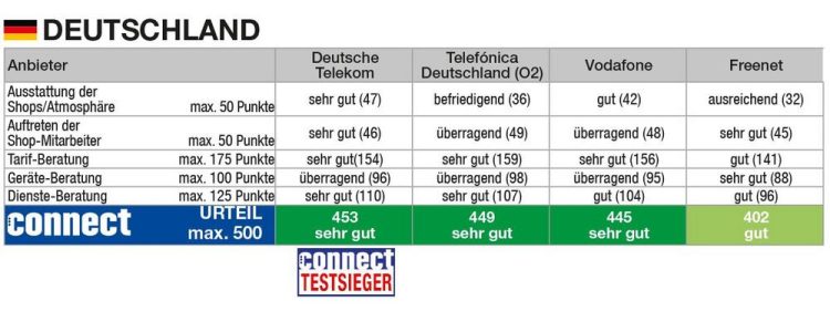 Die Telekom überzeugt auf allen Ebenen, dafür gibt es 453 von 500 Punkten und die Gesamtnote „sehr gut“. Telefónica folgt auf Platz zwei, mit 449 Punkten und dem Urteil „sehr gut“. Auf Platz drei folgt Vodafone mit 445 Punkten und ebenfalls der Note „sehr gut“ – eine Steigerung um 50 Punkte im Vergleich zum Vorjahresergebnis. Freenet erreicht mit 402 Punkten das Urteil „gut“ und den vierten Platz.