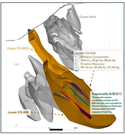 Jüngste metallurgische Tests, die bei Blue Coast Research unter der Aufsicht von Tad Crowie, P. Eng. von JDS Energy & Mining Inc. durchgeführt wurden, haben gezeigt, dass ein hochgradiges Kupferkonzentrat aus der Subdomäne Lower CS-600 produziert werden kann. Der Locked-Cycle-Test erzielte eine Gewinnung von 88,1 % Kupfer, 63,8 % Gold und 51,3 % Silber in einem Konzentrat mit einem Gehalt von mehr als 29 % Kupfer und 30 g/t Au bei Lower CS-600. Ein Locked-Cycle-Test gilt als wichtiger Schritt bei der Entwicklung eines Mineralaufbereitungs-Fließschemas, das die Flotation einschließt, da er die Auswirkungen der Recycle-Ströme auf den Gesamtprozess aufzeigt. Die Tests wurden mit Proben durchgeführt, die mit jenen übereinstimmen, die für die früheren metallurgischen Tests verwendet wurden, und die Gold- und Kupfergehalte von 0,91 g/t Au und 0,59 % Cu aufwiesen, was mit den Gehalten in der Subdomäne Lower CS-600 übereinstimmt.