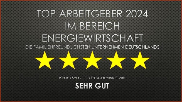 Die iKratos Solar- und Energietechnik GmbH wurde vom Magazin freundin in Zusammenarbeit mit dem Recherche-Institut FactField als einer der Top-Arbeitgeber 2024 ausgezeichnet. Das Ranking basiert auf über 840.000 Bewertungen zu über 33.000 deutschen Unternehmen die bis zum 27.05.2024 bei freundin eingegangen sind.